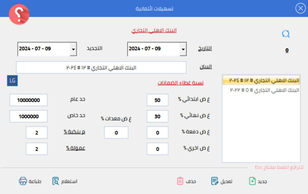 حد خاص : يتم تسجيل فيها حد تمويل الضمانات الابتدائية