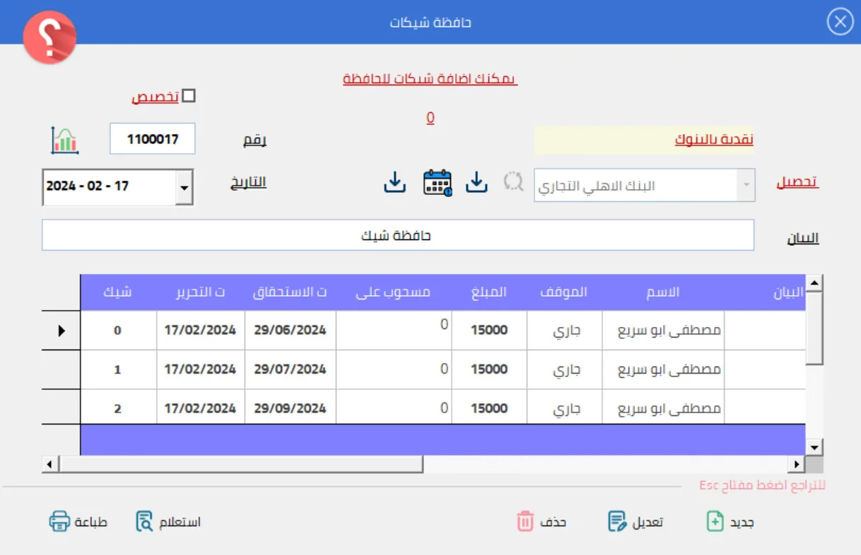 حافظة شيكات : يتم من خلالها انشاء حافظات شيكات مختلفة وذلك بتجميع الشيكات سواء لعميل معين او خاصه بتاريخ معين وذلك ليتم قبضها مره واحده