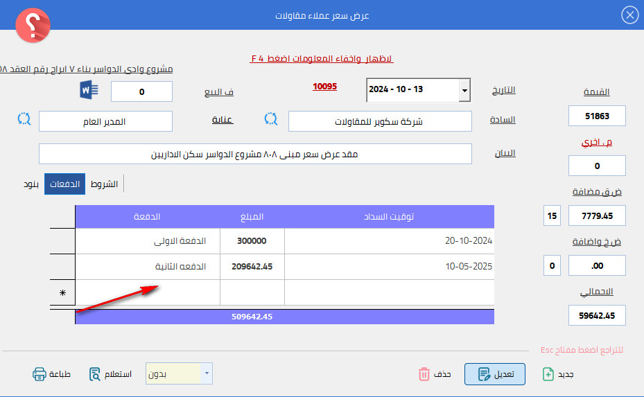 يتم توزيع مبلغ العقد على الدفعات او طرق الدفع المتفق عليها بالقيمةوتوقيت السداد