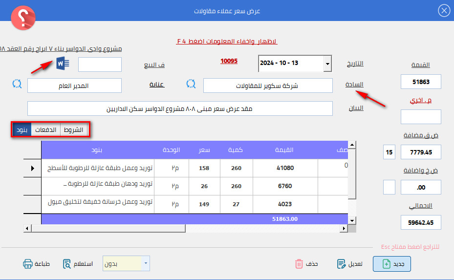 كما يتيح لك البرنامج طباعة العقد او تصديره بشكل تلقائى للورد بكافة التفاصيل