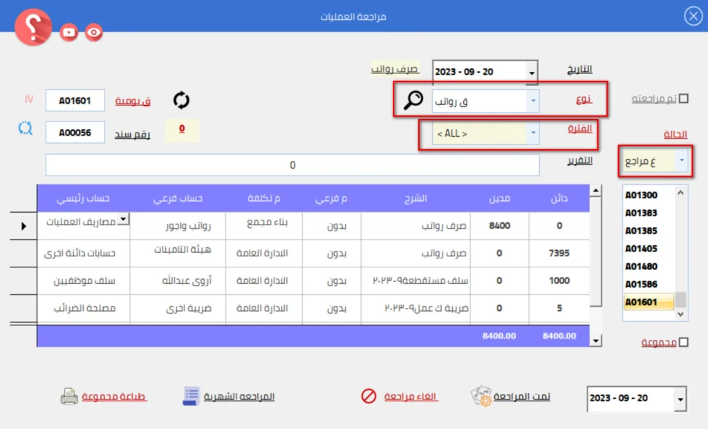 مراجعة القيود المحاسبية : من خلال هذه الشاشة يتم مراجعة العمليات المحاسبية التي تتم في البرنامج ويوجد خيار لاختيار النوع