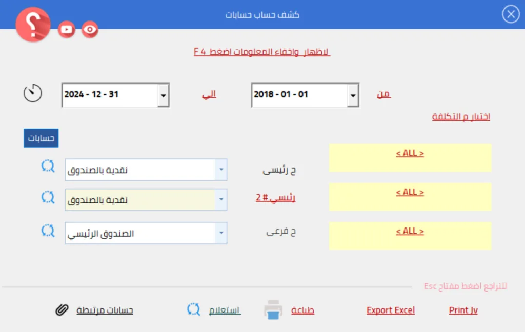 وهناك عدة اوبشنات فى اف 4 مثل اختيار العملة وايضا امكانية اظهار اللوجو عند الطباعة او لا وايضا اوبشن كل السنوات لاختيار الحساب من سنوات سابقة على نفس الداتا